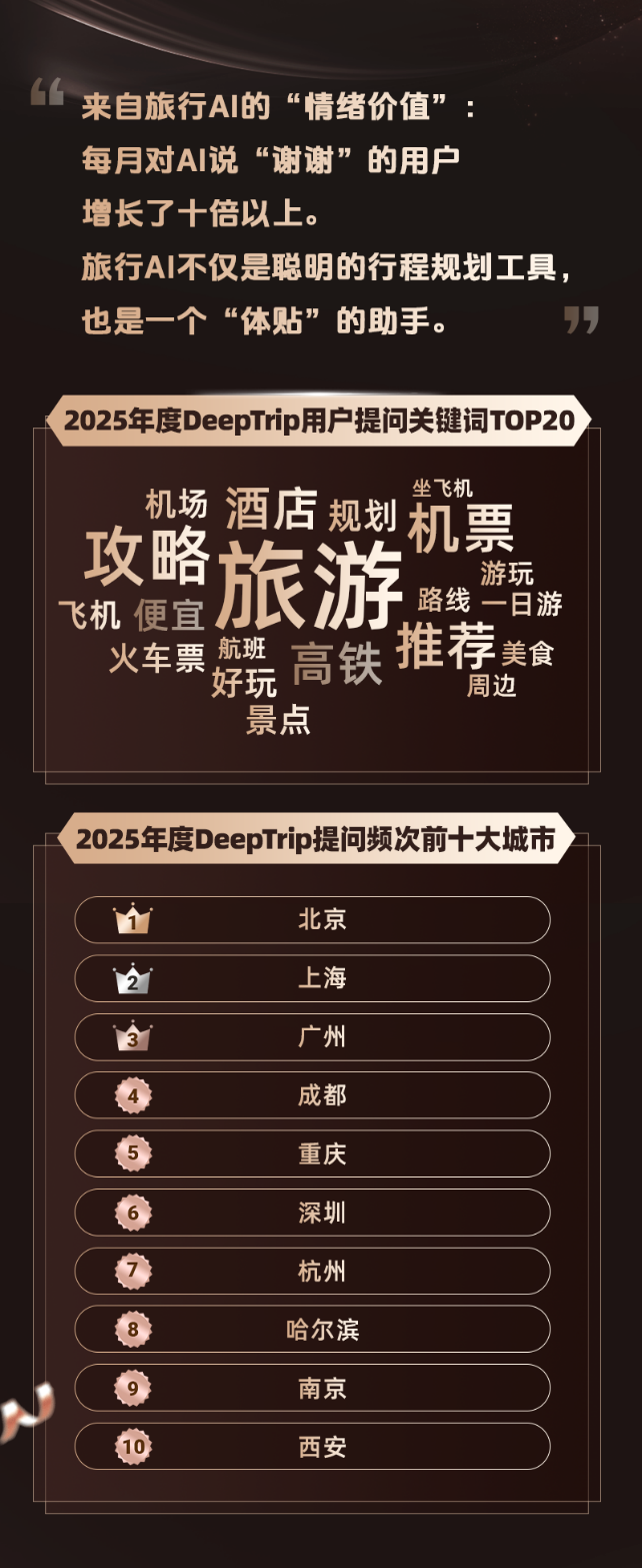 根據同程旅行DeepTrip2025年3月至12月的數據,用戶與DeepTrip的對話關鍵詞主要集中於旅遊行程規劃及交通、住宿等產品的預訂諮詢。在對話當中,北京、上海、廣州、成都、重慶、深圳、杭州等中心城市和熱門旅遊目的地被提及的次數相對較高。值得關注的是,隨着AI交互體驗的快速迭代,用戶越來越傾向於將AI視作自己的旅途夥伴而不僅僅是一個工具。數據顯示,在最近九個月時間裏,主動向AI發送“謝謝”的用戶數量增長了十餘倍。旅行智能體的“類人化”不僅解決了用戶的具體出行問題,而且在交互過程中也爲用戶提供了“情緒價值”。