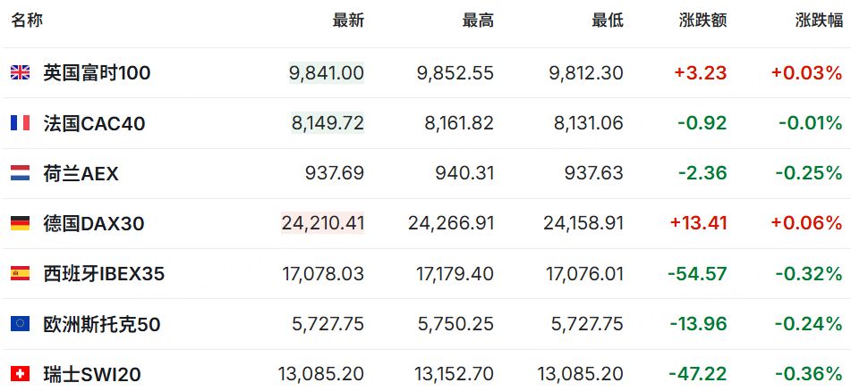 歐洲主要股指多數下跌,截至發稿,英國富時100漲0.03%,法國CAC40跌0.01%,德國DAX30指數漲0.06%。