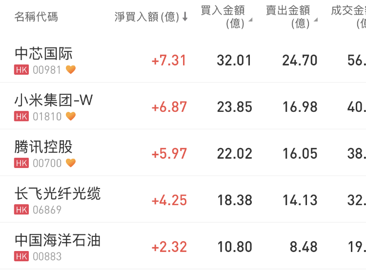 中芯國際、小米集團-W 、騰訊控股分別獲淨買入7.31億港元、6.87億港元、5.97億港元;