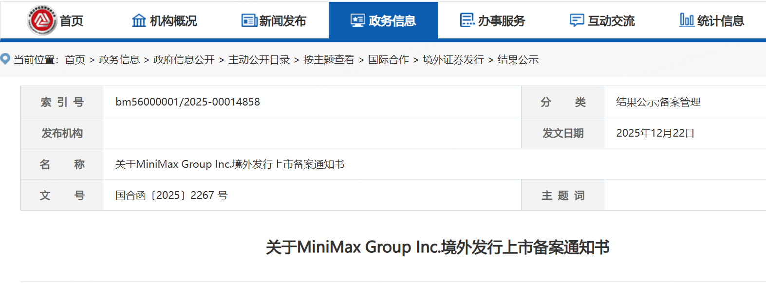 中國證監會國際合作司發佈關於MiniMax Group Inc.境外發行上市備案通知書,公司擬發行不超過33,577,240股境外上市普通股並在香港聯合交易所上市。