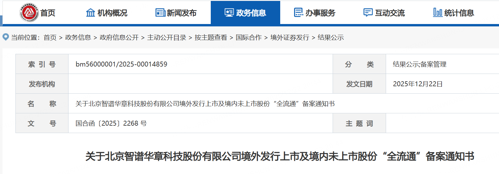 中國證監會國際合作司發佈關於北京智譜華章科技股份有限公司境外發行上市及境內未上市股份“全流通”備案通知書,公司擬發行不超過43,032,400股境外上市普通股並在香港聯合交易所上市。