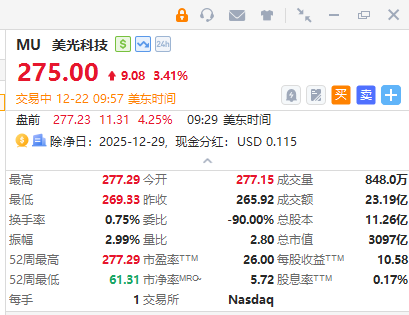 美光科技(MU.US)盤初漲超3.4%,報275美元刷新上市新高價。消息上,華泰證券維持美光科技(MU.US)“買入”評級,目標價360美元;FY26Q1營收利潤超預期,AI驅動HBM及DRAM需求高增,毛利率顯著提升。公司上調資本支出至200億美元,HBM4良率爬坡加快,SOCAMM2先發優勢明顯。NAND受益於AI服務器SSD擴容。盈利預測大幅上調,切換至15.0x FY26E PE估值,目標價升至360美元。