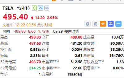 華盛資訊12月22日訊,特斯拉股價盤初漲近3%,高見498.83美元刷新歷史新高,最近120個交易日漲幅累計達57%,最新總市值高達1.65萬億美元。