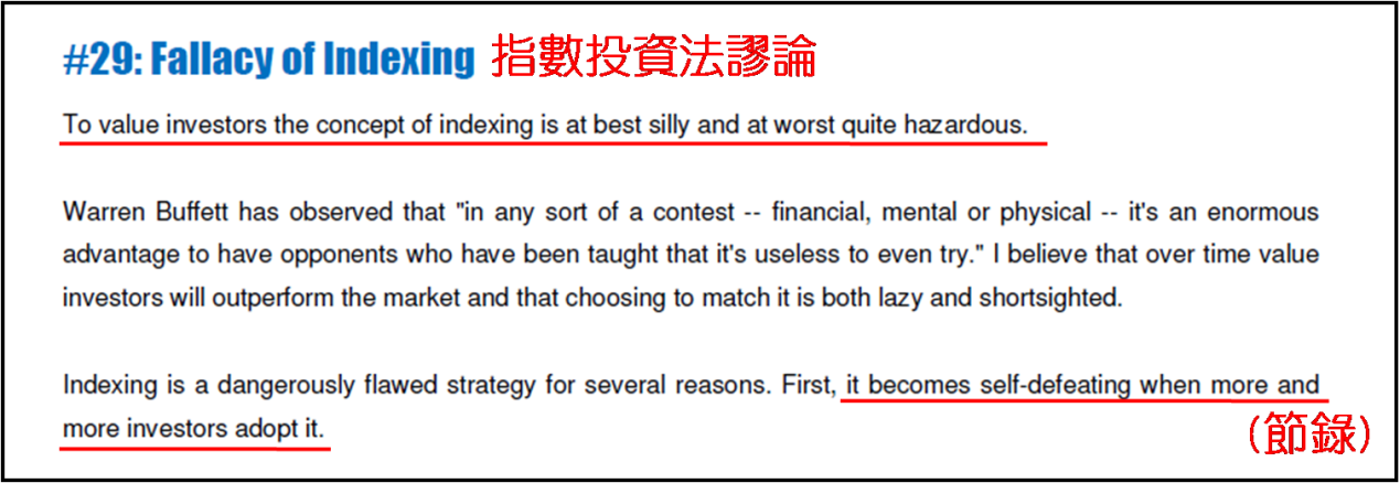 對於第二十九個思想,卡拉曼指出對價值投資者來說,指數投資法這個概念其實往好方向想也不過是愚蠢行爲,往壞方向想更是非常危險行爲。巴菲特曾說過:“在任何一種競賽中 ── 金融的、智力的或體力的 ── 若有對手的行爲經已教曉你試都無謂,這實在是給你天大的好處。”卡拉曼相信隨着時間推移,價投者終究的表現會優於大市,並優於那些複製指數選股的懶惰又短視投資者。由於多種原因,複製指數投資是一種危險而帶着缺陷策略。