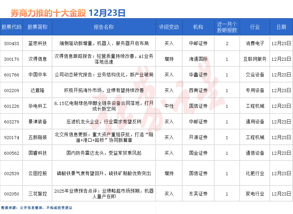 據證券之星數據庫不完全統計,12月23日券商共給予超10家A股上市公司“買入”評級。從行業分佈看,券商12月23日關注的個股聚焦於消費電子、互聯網服務、交運設備、專用設備、工程機械、通用設備、化肥、家電等行業。