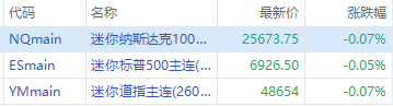 週二盤前,三大股指期貨齊跌,截至發稿,納指期貨 $NQmain 跌0.07%,標普500期貨 $ESmain 跌0.05%,道指期貨 $YMmain 跌0.07%。