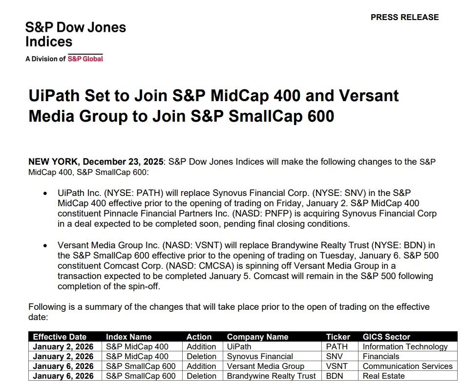 UiPath將取代西諾烏斯金融成爲標普中盤股400指數成分股,調整於2026年1月2日開盤前生效。