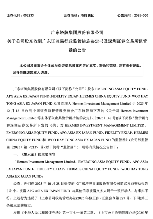日前,粵東水泥龍頭塔牌集團(002233.SZ)因一致行動人認定不準確,被廣東證監局出具警示函、深交所下發監管函。