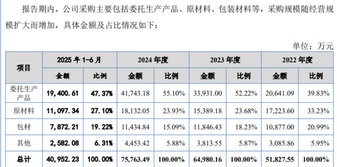 英氏控股在招股書中披露,其核心產品米粉直至2025年才實現完全自主生產,而包括嬰幼兒輔食、兒童食品、營養食品及少量衛生用品在內的其餘產品,仍主要採用委託生產模式。報告期內,公司委託生產採購佔比呈波動上升趨勢,從期初的39.83%升至2024年的55.10%,2025年上半年雖回落至47.37%,但仍處於較高水平。