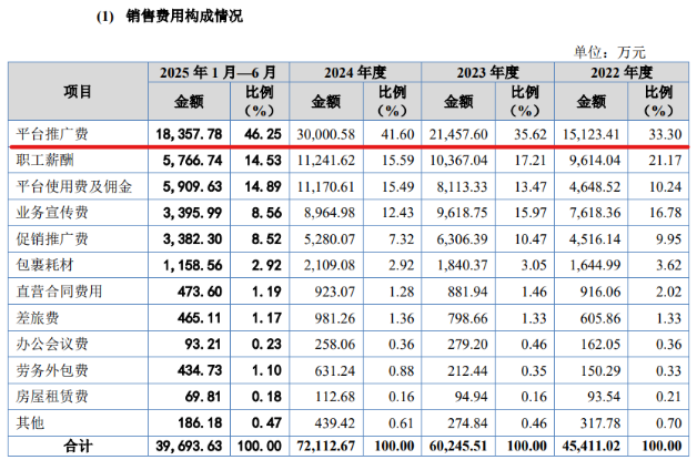 報告期內,英氏控股的銷售費用由2022年的4.54億元上升至2024年的7.21億元,今年上半年達到3.97億元,其中各期平臺推廣費分別高達1.51億元、2.15億元、3億元以及1.84億元,佔銷售費用的比重由期初的33.3%增長至期末的46.25%。