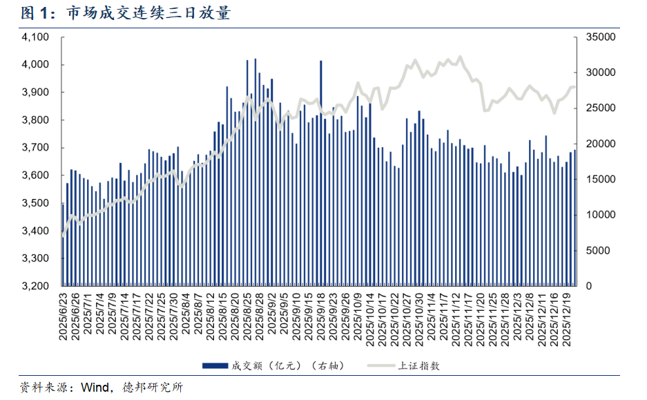 連續放量市場回暖,題材+科技或仍爲主線。今日市場雖然震盪上行,但整體跌多漲少,前期熱門的板塊如商業航天板塊出現大幅調整,或反映市場風格在連續上漲後有所變化,但整體依然是延續“題材+科技”主線思路,建議繼續聚焦科技製造、週期資源、政策催化。科技方面,雖然前期市場普遍擔憂AI泡沫破裂,但以英偉達新產品爲代表的人工智能仍在快速發展,市場熱度維持;資源方面,以碳酸鋰爲代表的反內卷品種持續上漲,爲企業盈利提升打開空間;政策方面,中央經濟工作會議強調“深入實施提振消費專項行動”,商務部“三新”試點細化消費領域刺激空間,海南封關打開區域經濟增量,可控核聚變、商業航天等前沿技術領域頻現消息刺激,均爲市場帶來相應看點。市場連續三日成交額放量,表明情緒逐步回暖,A股慢牛格局有望深化,但需警惕年末流動性波動與板塊輪動風險。