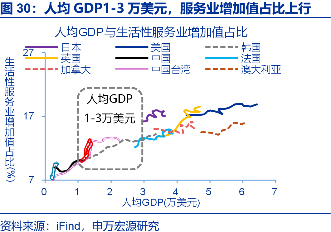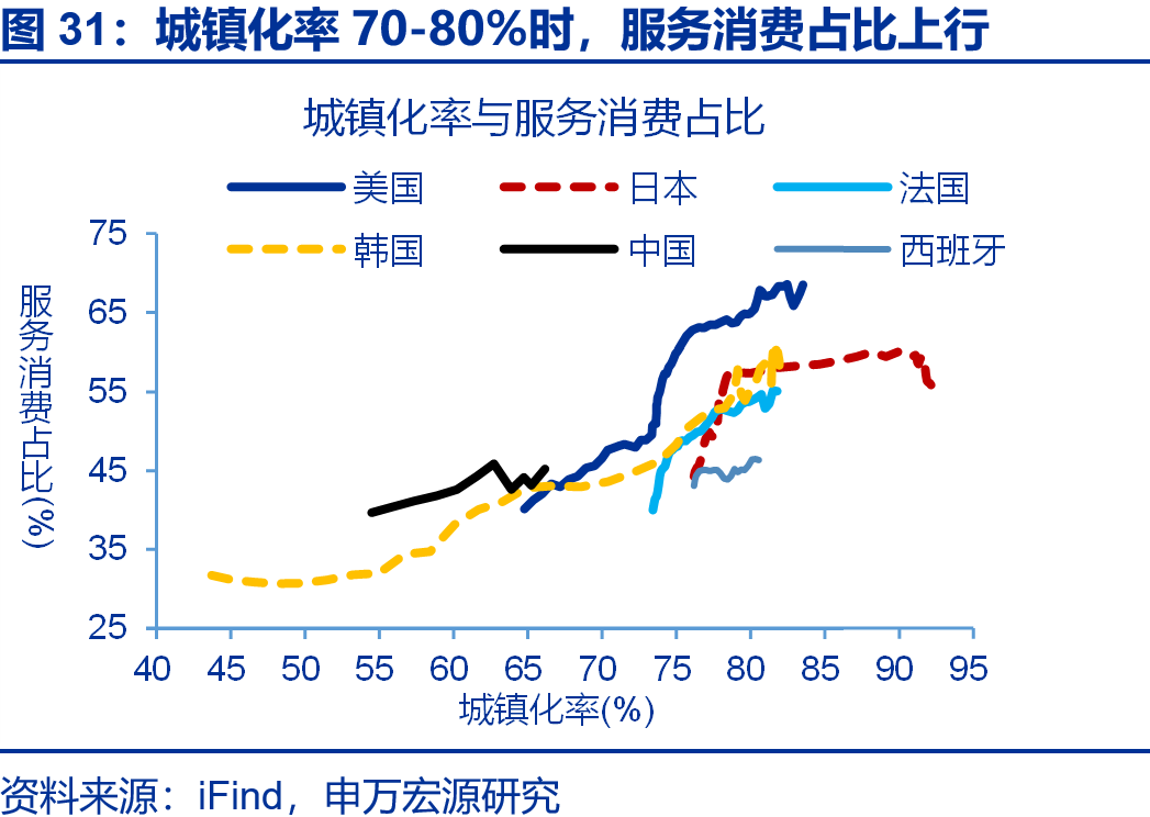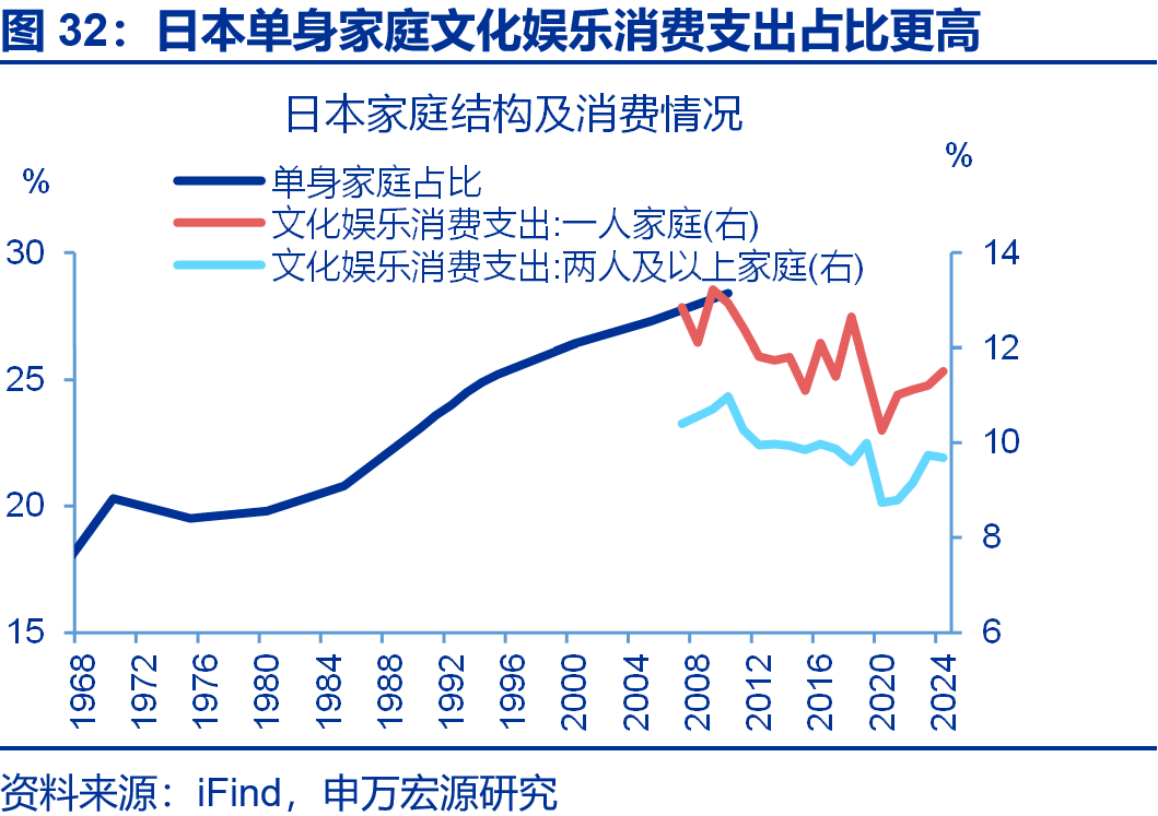 參考全球經驗,經濟發展階段與中觀社會趨勢均指向,居民消費長期可能會從商品向服務轉型。全球經驗顯示,人均GDP在1-3萬美元、城鎮化率達70%、人口進入老齡化階段時,服務消費的空間打開;墨西哥、阿根廷等處中等收入陷阱國家也類似。中觀層面家庭規模小型化(單身佔比提升)、出生率下行會強化文體娛、旅遊、美容等享受型服務需求,當下我國恰恰處於該階段。