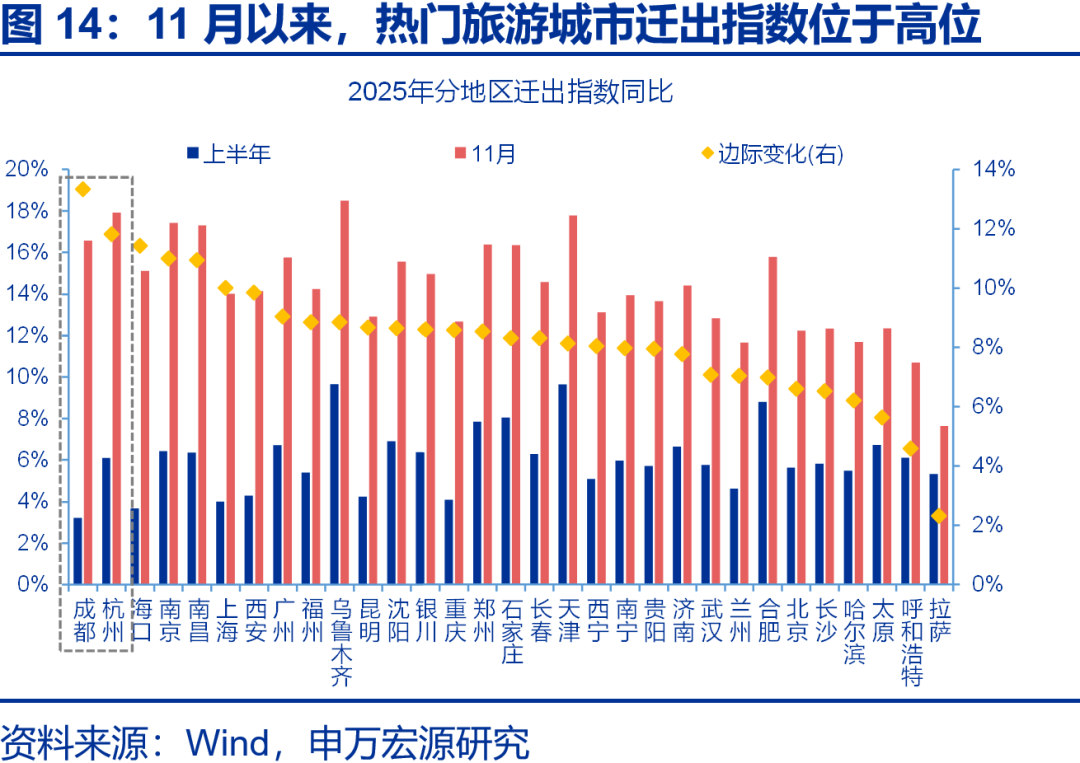 11月來多地推出秋假政策,對居民出行意願形成較大提振。11月來,四川、浙江、廣東、湖北等多地秋假政策落地,其中四川、浙江在全省範圍推行,對出行需求的釋放形成較大拉動;成都、杭州人員跨區遷入指數同比分別較上半年上行13.2、13個百分點;遷出指數同比分別較上半年上行13.3、11.8個百分點。並且兩省的常住人口占全國比重超10%,因而對全國出行的貢獻也較高。