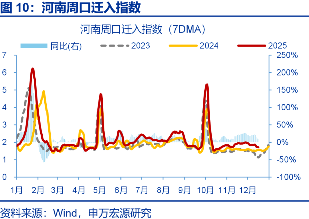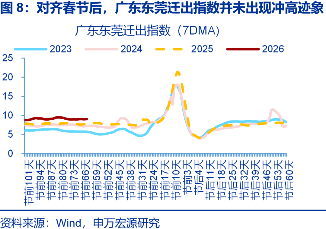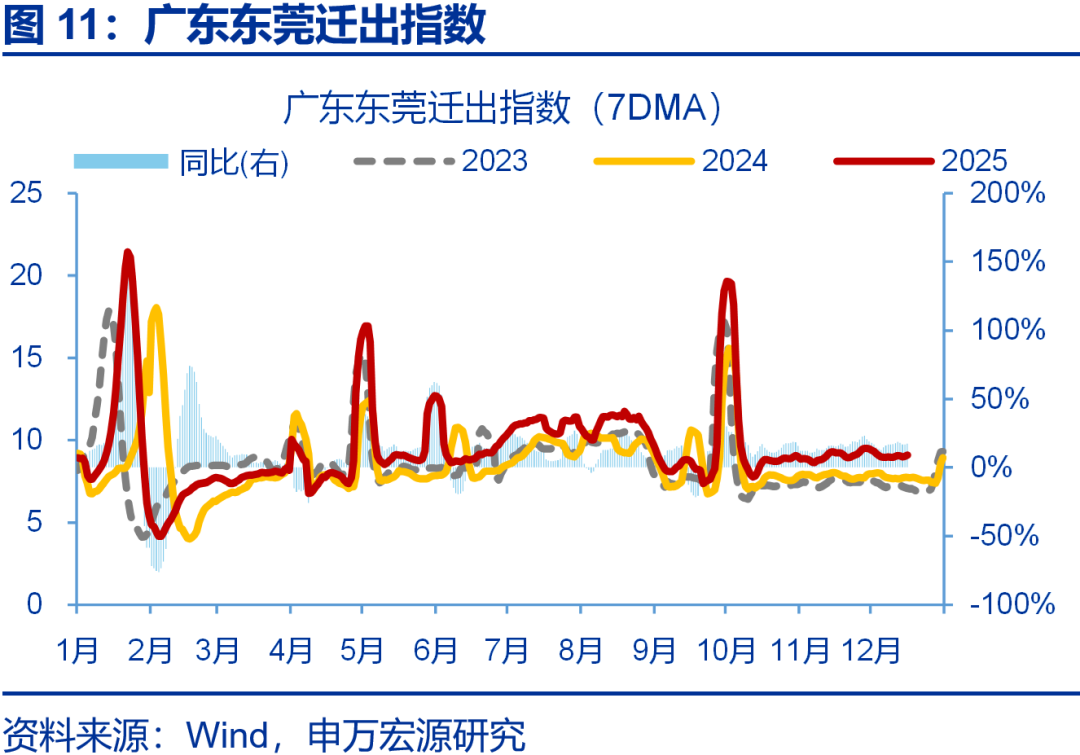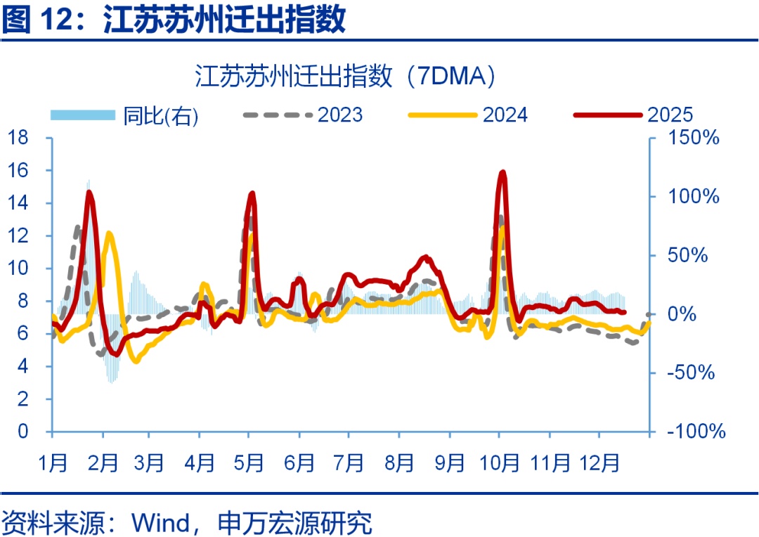 從人流方向看,勞務輸出城市的遷入強度以及用工大省的遷出強度較平淡,或也表明“返鄉潮”並非當前人流高位的主因。以四川南充、河南周口爲代表的傳統勞務輸出地爲例,近期人員跨區流動強度偏低;且省內流動比重更高(77.5%、64%)、超過春節前的集中返鄉期(59.2%、36.6%)。從遷出地看,廣東東莞、江蘇蘇州等典型用工城市,遷出強度也低於全國平均,12月中旬同比在15%左右。