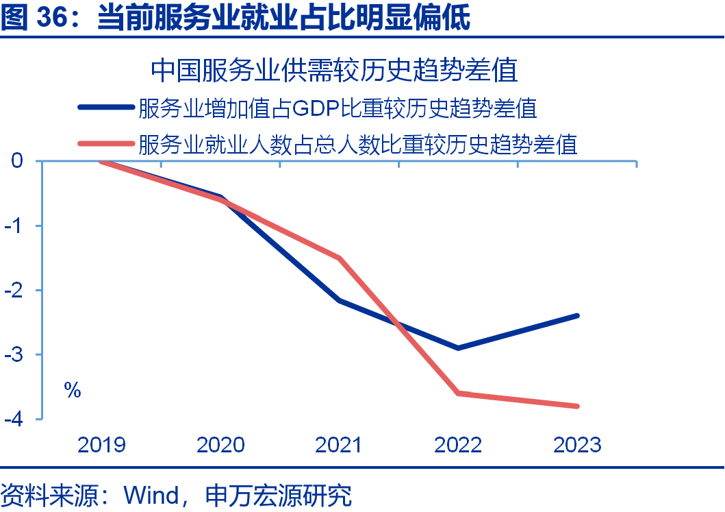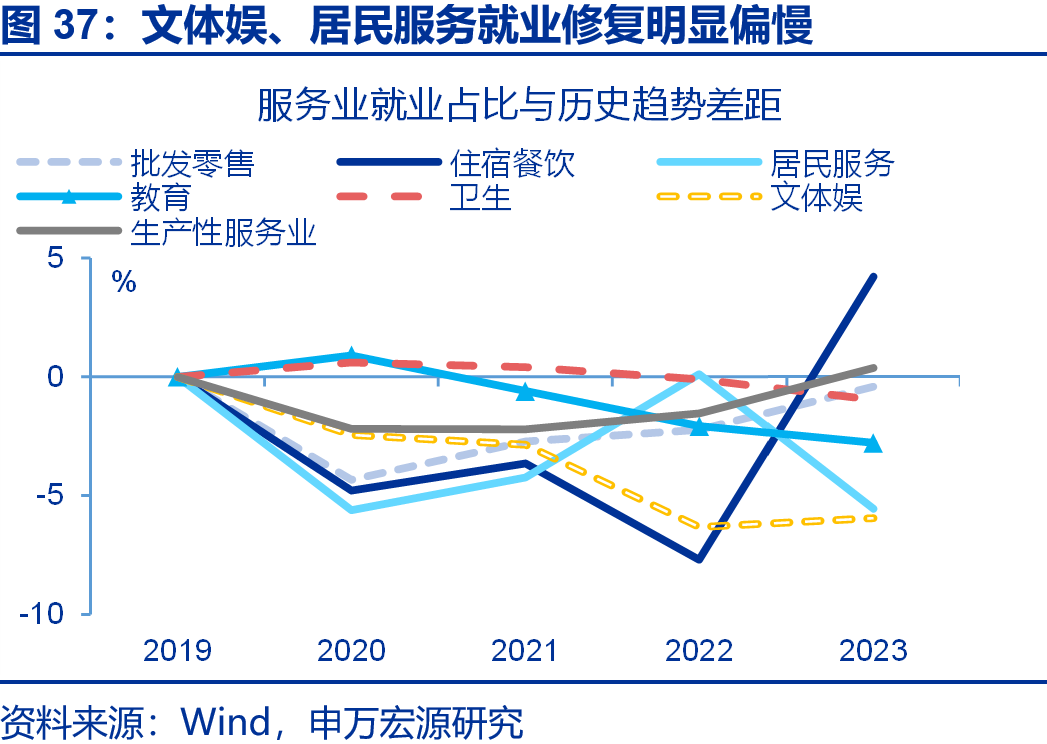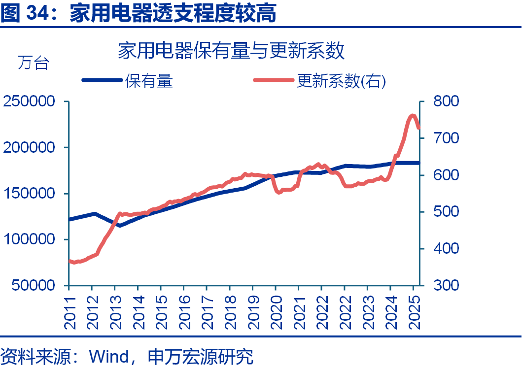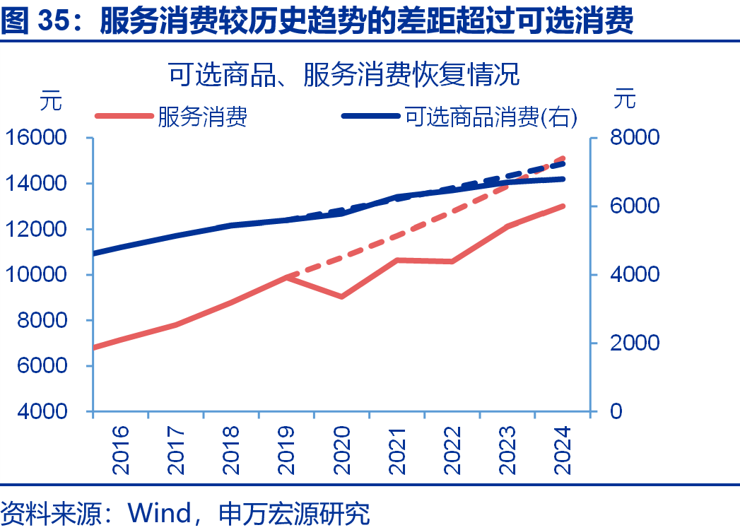 展望明年,商品消費可能仍有壓力,但服務消費潛力或被市場忽視,預計居民實際消費或好於社零讀數。2024年,商品消費已修復到位;而服務消費空間仍較大,居民人均服務性消費較潛在水平的缺口爲2093元,以全國14億人計,總缺口高達近3萬億元。當前以舊換新政策帶來的商品透支效應逐步顯現,如家用電器更新系數明顯抬升,而服務消費尚未被透支。促消費政策已在向服務業傾斜,包括增加假期、發放消費券、加大消費類基建(增加有效供給、供給創造需求)等;加之多數國家經驗顯示,居民需求長期呈現服務向商品轉型的趨勢,因而明年服務消費的增長空間更大。另外,當前文體娛、居民服務等行業就業明顯不足,促進服務消費也具有穩就業的效果。