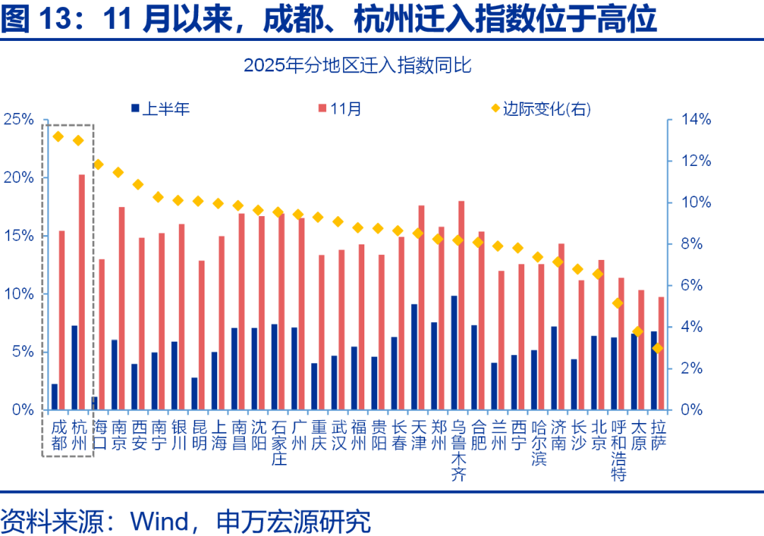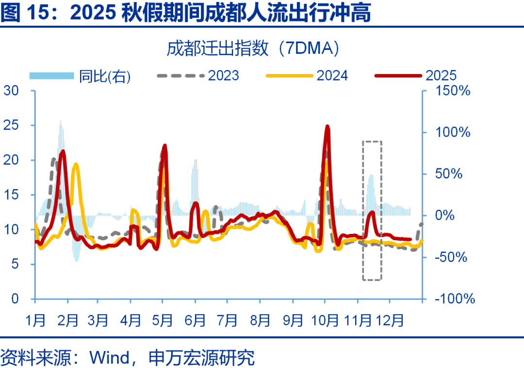 11月來多地秋假政策落地,對居民出行意願形成較大提振。11月以來,四川、浙江、廣東、湖北等多個地區相繼開啓秋假,其中四川、浙江在全省範圍推行秋假,對出行需求的釋放形成較大拉動。11月成都、杭州人員跨區流動強度明顯走高,遷入指數同比分別爲15.4%、20.3%,較上半年上行13.2、13個百分點;遷出指數同比分別爲16.6%、17.9%,較上半年上行13.3、11.8個百分點。並且兩省的常住人口占全國比重已超10%,因而對全國出行的貢獻也較高。
