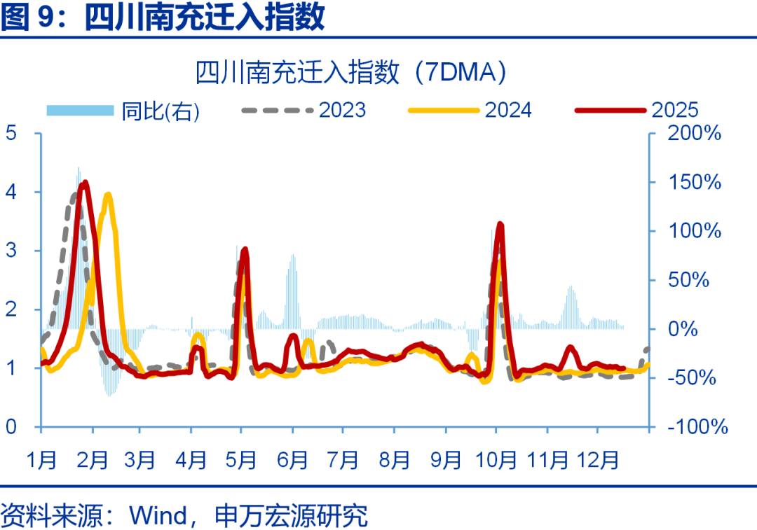 從人流方向看,勞務輸出城市的遷入強度以及用工大省的遷出強度較平淡,或也表明“返鄉潮”並非當前人流高位的主因。以四川南充、河南周口爲代表的傳統勞務輸出地區,近期人員跨區流動強度偏低;12月中旬兩個城市遷入指數同比降至10%以下。四川南充、河南周口的省內流動比重較高;12月中旬分別是77.5%、64%,明顯高於春節前的集中返鄉期(分別59.2%、36.6%)。從遷出地看,廣東東莞、江蘇蘇州等典型勞務輸出城市,遷出指數表現也低於全國遷徙強度,12月中旬同比均在15%左右。