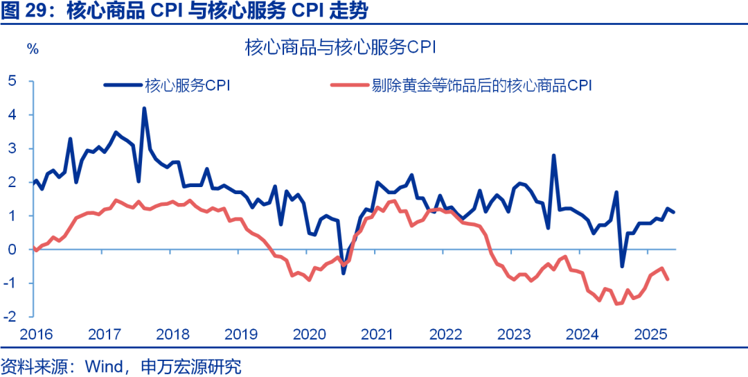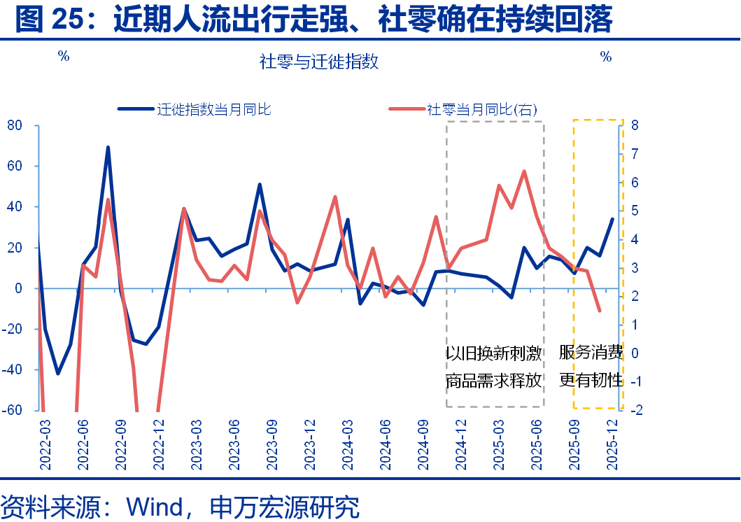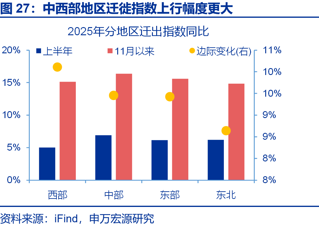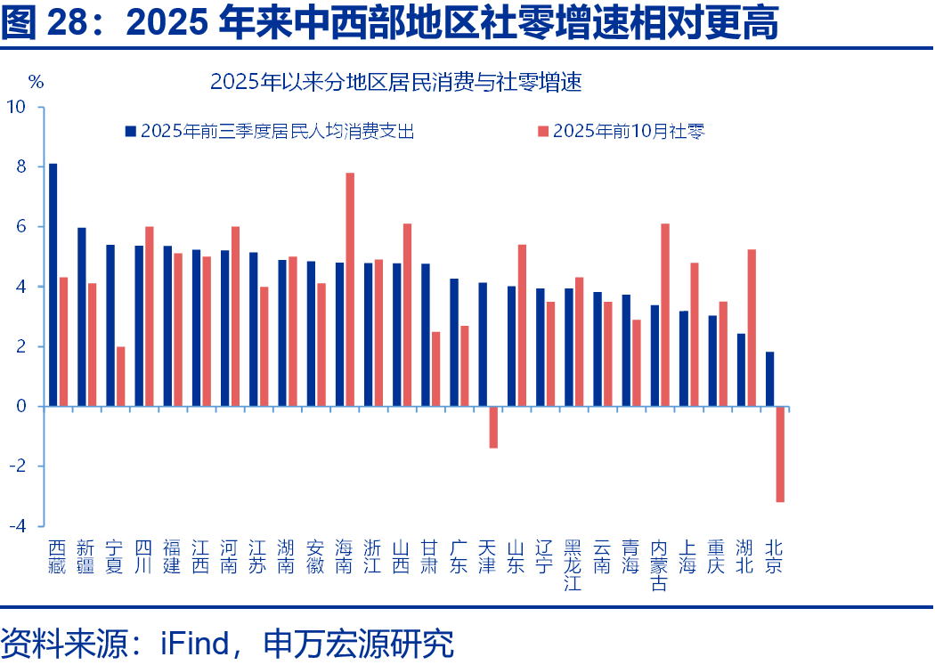 人流出行高位會更多帶動餐飲、住宿等服務消費,也映射出當前服務消費景氣較高。過往全國遷徙指數與社零增速走勢較同步,但2024年四季度後二者出現較大分化;其中今年9月來,人流出行走高,而社零增速持續回落,或反映服務消費韌性強於商品。數據上9月來服務零售增速持續上行,而商品零售累計增速則回落至4.1%;價格層面也呈現核心服務CPI持續高於剔除黃金的核心商品CPI的特徵。從區域維度看,中西部地區的人流活躍度更高,以“賣家所在地”統計的社零表現較消費者所在地統計的居民消費支出更好,或體現區域消費向中西部地區轉移的趨勢在強化。