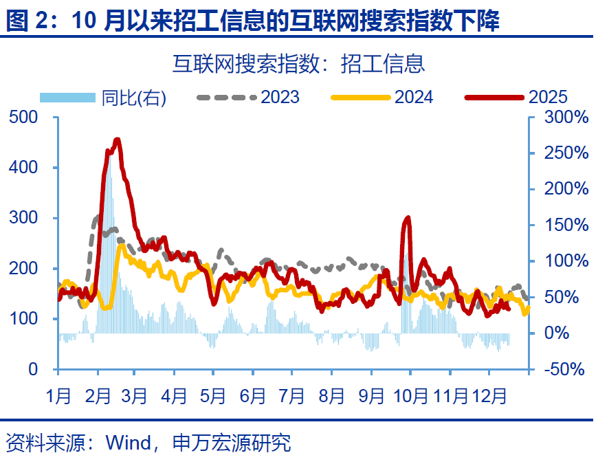 近期工業生產、基建投資有所回落下,跨區人流持續高位;部分觀點認爲“返鄉潮”已提前到來。對比過往,今年國慶假期後人流出行持續高位,全國遷徙指數同比維持在15.3%較高水平。部分觀點指出當前人流出行走強可能源於近期工業生產、傳統基建投資弱勢表現,導致用工需求減少、促使務工人員提前返鄉;數據上招工信息搜索指數在10月下旬回落明顯、當前已低於前兩年同期水平。