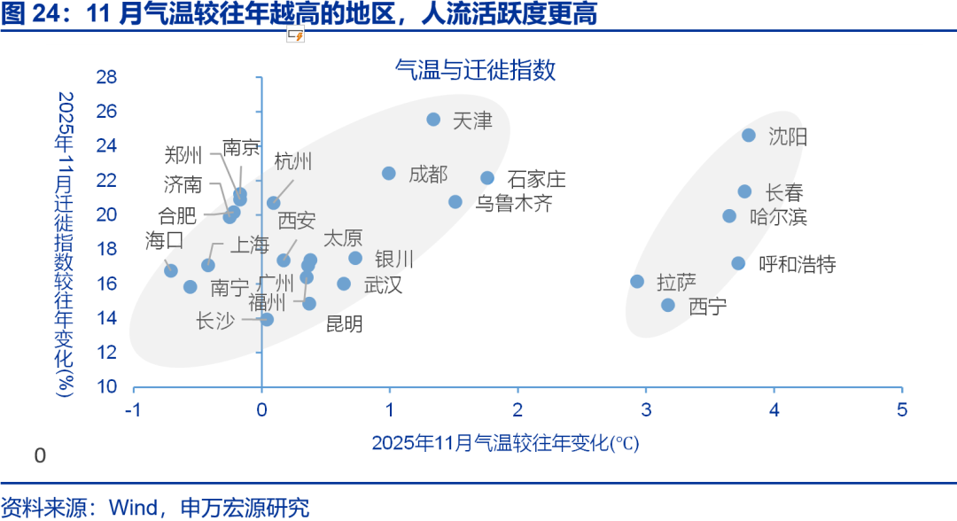 同時今年冬季氣溫較往年偏暖,可能延長居民出行窗口期,支撐全國出行維持高位。11月,全國平均氣溫4.2℃,超過過去五年同期0.2℃;12月以來,多地氣溫延續偏高態勢。暖冬天氣會延長居民跨區域出行窗口期,數據上11月氣溫較往年越高的地區,人流活躍度更高;譬如11月天津、石家莊平均氣溫分別高於往年同期1.3℃、1.8℃,對應遷徙規模指數也超過往年25.6%、22.2%