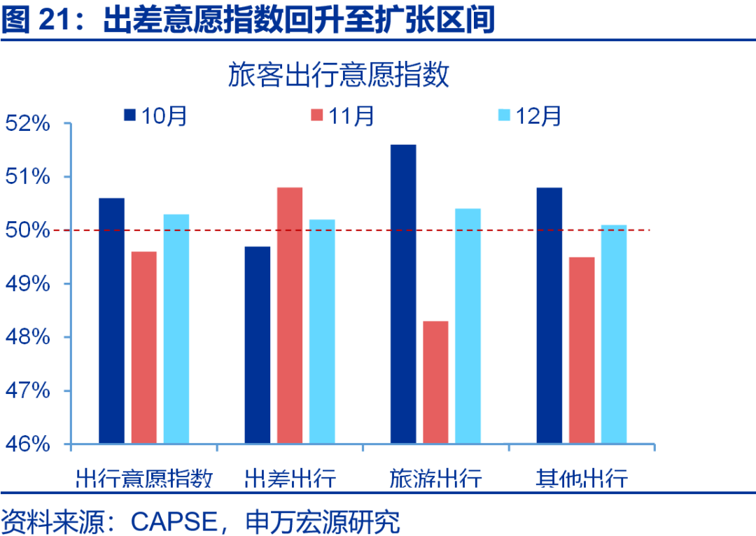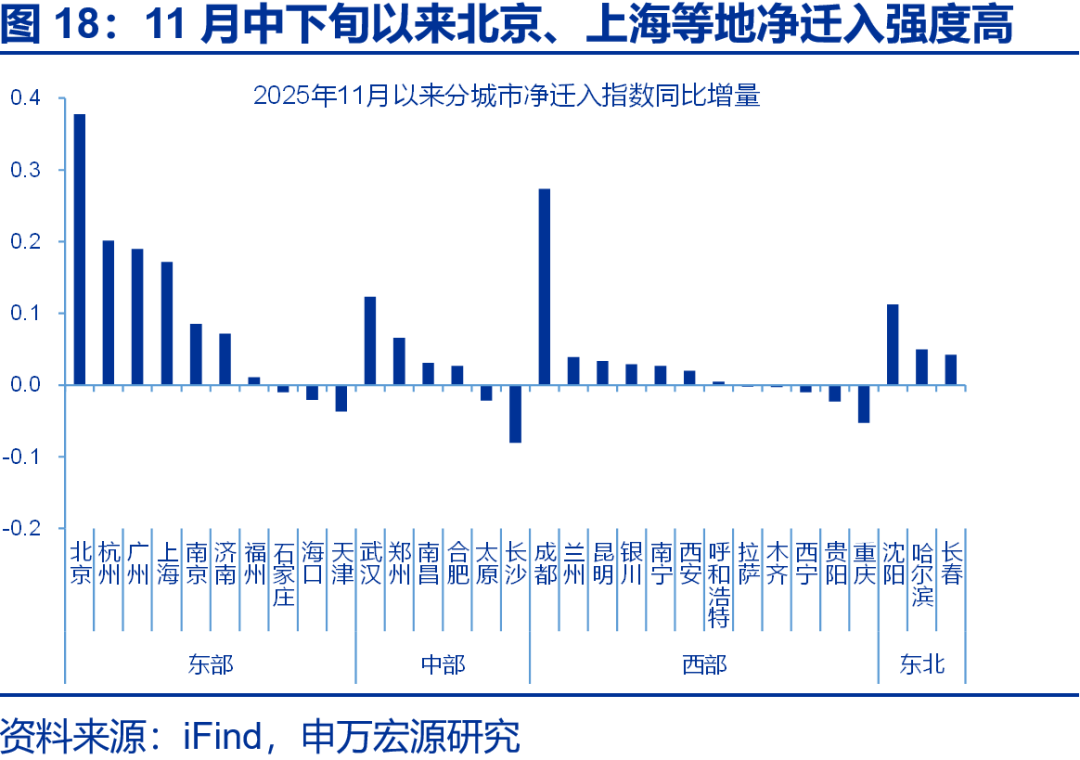 人流仍在向北京、上海等較高能級城市集中,或反映商務出行也在增多。11月中下旬來,反映市內人流恢復情況的地鐵客流、城市擁堵等指標修復明顯放緩;但跨區商務出行明顯提升,11月國內、國際執行航班架次同比分別在2%、10%附近,旅客出差意願指數回升至擴張區間(50.8%);從人流方向看,北京、廣州、上海等一線城市淨遷入強度明顯更高,同比分別爲0.4、0.2、0.2。