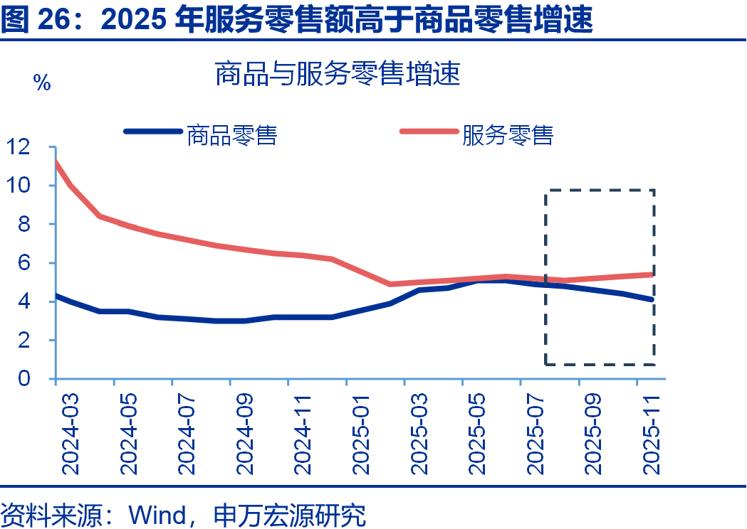 展望明年,商品消費可能仍有壓力,但服務消費潛力或被市場忽視,預計居民實際消費或好於社零讀數。當前以舊換新政策帶來的商品透支效應顯現,而服務消費尚未被透支、且修復彈性較大。促消費政策已在向服務業傾斜,包括增加假期、發放消費券、加大消費類基建等;加之多數國家經驗顯示,居民需求長期呈現服務向商品轉型的趨勢,因而明年服務消費的增長空間更大。