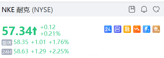 耐克股價週二微漲0.2%至57.34美元,盤後交易中再漲1.76%至58.35美元。夜盤漲超2%。由於這家運動巨頭正努力重回正軌,其股價年內累計下跌約25%,甚至低於十年前的水平。
