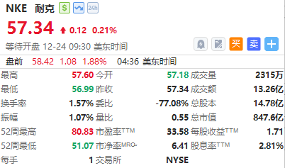 耐克盤前漲近2%。申報資料顯示,蘋果CEO庫克於本週一以平均每股58.97美元的價格購入5萬股耐克股票,交易金額接近300萬美元。