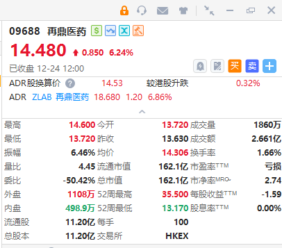 華盛資訊12月24日訊,熱門中概股走勢分化,再鼎醫藥大漲超6%,重磅抗精神分裂症新藥凱捷樂在中國獲批上市;