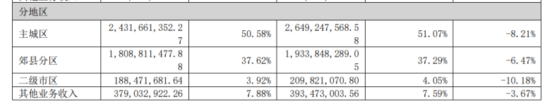 證券之星注意到,今年上半年,來自核心區域的收入繼續失守,主城區收入同比下滑8.21%,郊縣分區和二級市區的收入分別同比下滑6.47%和10.18%,區域增長動力持續減弱。