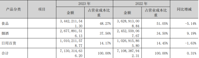 然而,門店網絡的擴張與升級卻未能有效帶動營收的同步復甦。2023年,公司營收僅同比微增1.12%。同期歸母淨利潤雖實現15.53%的增長,但這一表現部分受益於投資收益同比大幅增長46.89%的拉動。拆分該年的產品表現看,僅菸酒品類實現收入增長,這在一定程度上得益於菸草銷售的牌照限制,而食品和日用百貨收入均呈現同比下滑。