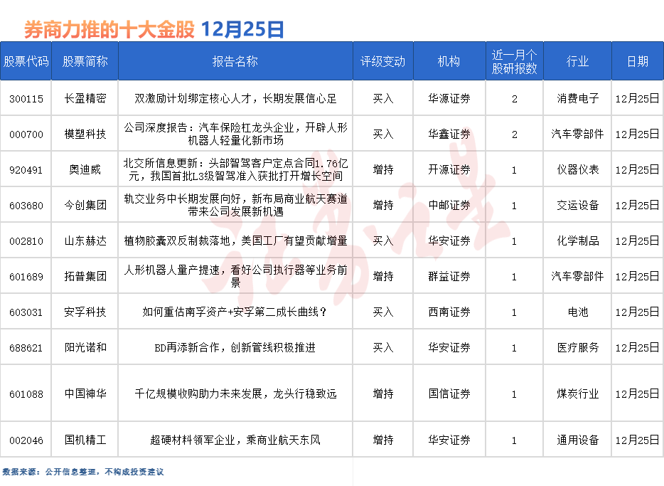 據證券之星數據庫不完全統計,12月25日券商共給予超10家A股上市公司“買入”評級。從行業分佈看,券商12月25日關注的個股聚焦於消費電子、汽車零部件、儀器儀表、交運設備、化學制品、電池、醫療服務、煤炭、通用設備等行業。