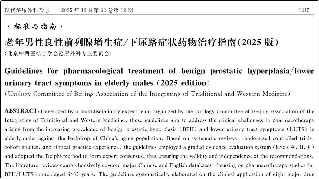 據瞭解,隨着我國人口老齡化進程的加快,老年男性良性前列腺增生症(BPH)及其相關下尿路症狀(LUTS)的發病率逐年上升,已成爲重要的公共衛生問題。藥物是治療的重要手段,可以改善症狀並提高患者生活質量。基於此,北京中西醫結合學會泌尿外科專業委員會組織多學科專家團隊制訂了《指南》,爲老年男性良性前列腺增生症/下尿路症狀治療提供了診療依據。