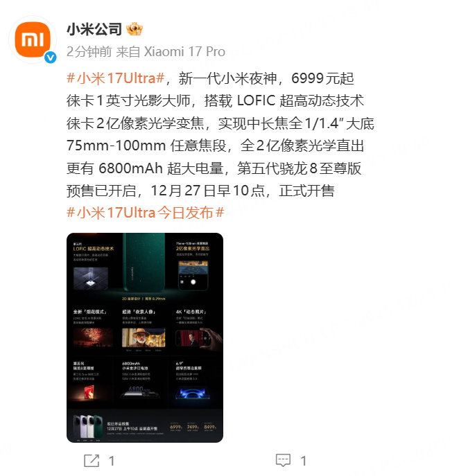 小米正式發佈小米17 ultra,起售價6999元人民幣起;該機型現已開啓預售,將於12月27日10時正式開售,比上一代ultra機型起售價漲價500元人民幣。