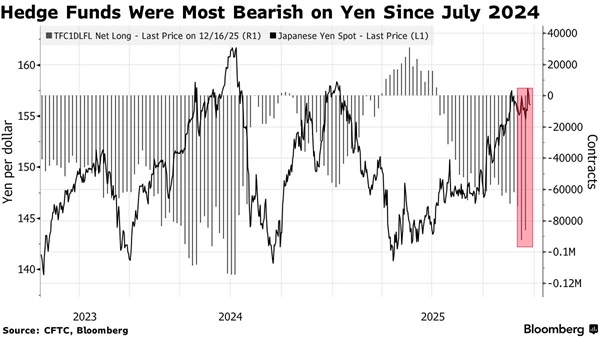 根據美國商品期貨交易委員會(CFTC)數據,截至12月9日當週,槓桿基金對日元的看空程度創下自2024年7月以來最高,並在隨後一週大體維持這些倉位。