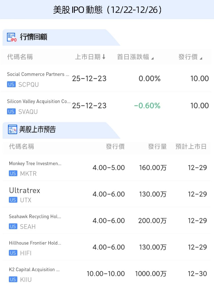 兩隻新股 $SCPQU $SVAQU 均於23日(本週二)上市,股價較招股價均變動不大。