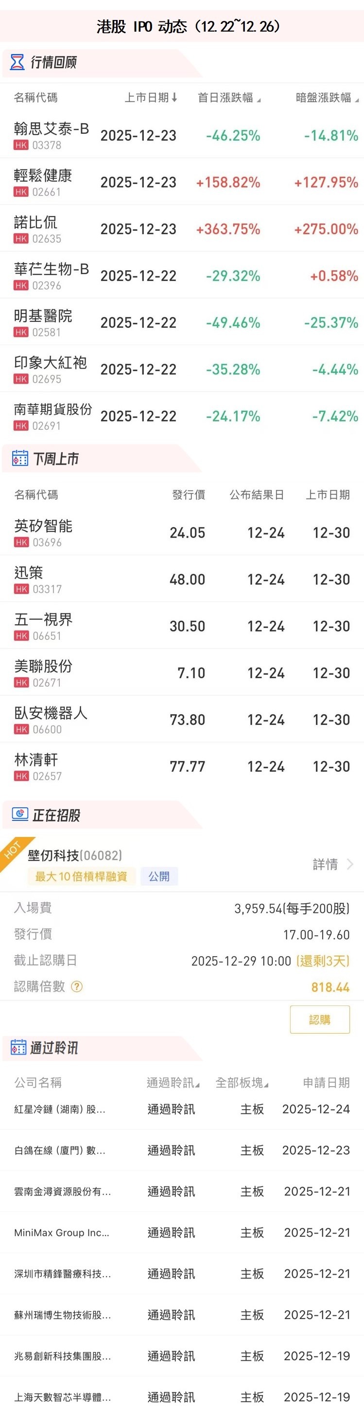 華盛資訊12月26日訊,港股年末上新不斷!本週港股有7只新股上市,其中諾比侃、輕鬆健康上市首日分別暴漲363.75%、158.82%!另還有6只新股已完成招股,將於下週二上市,其中“AI藥企”英矽智能及高端國貨護膚品牌林清軒雙雙獲逾千倍認購。此外,港股GPU第一股壁仞科技仍在火熱招股中。