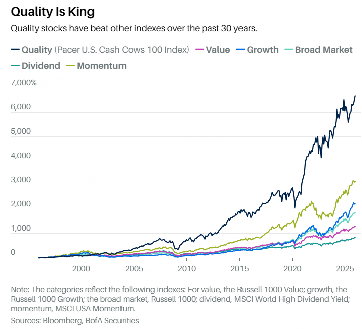 “質量”這個詞對任何消費者來說都很有吸引力——無論是在汽車賣場踢輪胎的人,還是在生鮮區聞瓜香的人。對投資者而言,高質量公司意味着財務韌性——這正好可以抵消當下對人工智能支出失控的擔憂,或最近一批商業模式不穩健的公司(比如融資囤積加密貨幣的企業)帶來的疑慮。如果瑞銀判斷正確,即高質量股票在統計上到了該反彈的時候,那就更好了。