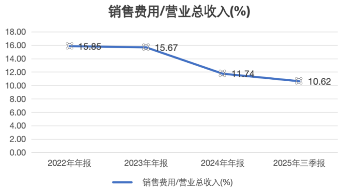 銷售費用從2022年的386億元降至2024年的336億元,三年累計下降13%;2025年前三季度銷售費用爲248億元,同比再降13.69%;銷售費用率(銷售費用/營收)從2022年的15.85%一路下滑至2025年Q3的10.62%。
