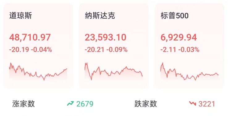 週五(12月26日),截至收盤,道指跌20.19點,跌幅爲0.04%,報48710.97點;納指跌20.21點,跌幅爲0.09%,報23593.10點;標普500指數跌2.11點,跌幅爲0.03%,報6929.94點。