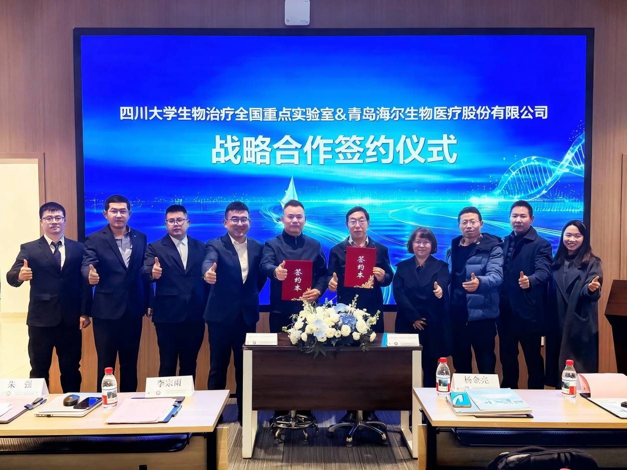 2025年12月27日,青島海爾生物醫療股份有限公司(以下簡稱“海爾生物”)與四川大學生物治療全國重點實驗室(以下簡稱“川大全國重點實驗室”)在成都轉化醫學大樓正式簽署戰略合作協議。雙方旨在圍繞生物醫療大健康產業發展需求,聚焦醫工交叉技術創新、產品研發與場景應用,通過統籌核心資源,在技術合作、平臺建設、市場拓展及資源整合等方面建立全方位、深層次的長期共贏機制。