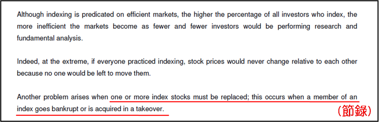 卡拉曼相信複製指數投資法只是在華爾街的另一潮流而已,隨着時間推移,被納入受歡迎股指的成份股價格,幾乎肯定將要較被剔除的跌得更多。更重要的是,正如巴菲特所說:“因爲所編制指數表現的成功,強化了數本身的表現,於是進一步促使更多指數被編制出現,形成一個自我強化反饋循環,令市場上的股指變得越來越多。”不得不承認卡拉曼這九十年代提出的觀點具前瞻性,正好道指現時追蹤指數基金 (ETF) 在全球主要股市均大行其道。然而,股指行情終有逆轉時候,那時複製指數的投資策略失去吸引力,成份股被紛紛拋售,加劇股指跌勢,成份股進一步捱沽,形成惡性循環。