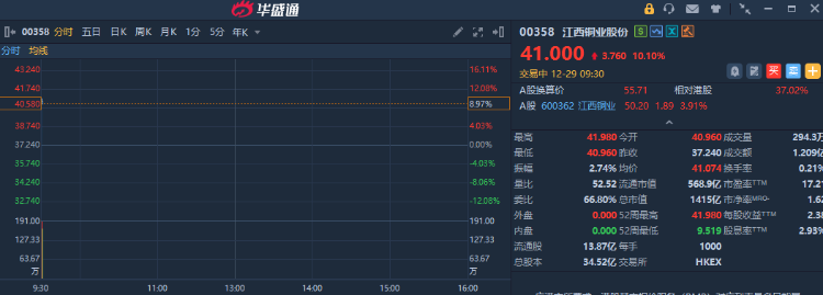 華盛資訊12月29日訊,港股有色金屬板塊開盤大漲,江西銅業股份漲約10%,此前公司宣佈擬收購索爾黃金。