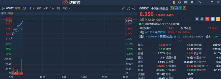 華盛資訊12月29日訊,港股油氣股盤中上漲,中國石油股份漲超2%,公司旗下新疆油田成我國首個年注碳百萬噸油田。