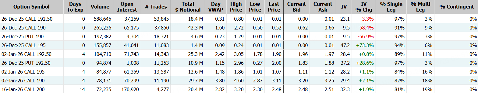 期權方面,英偉達成交325.55萬張,環比前一交易日激增逾180%,看漲期權佔比大幅攀升至68.3%,其中於12月26日到期的192.5美元行使價的看漲期權成交居前,成交58.86萬張。