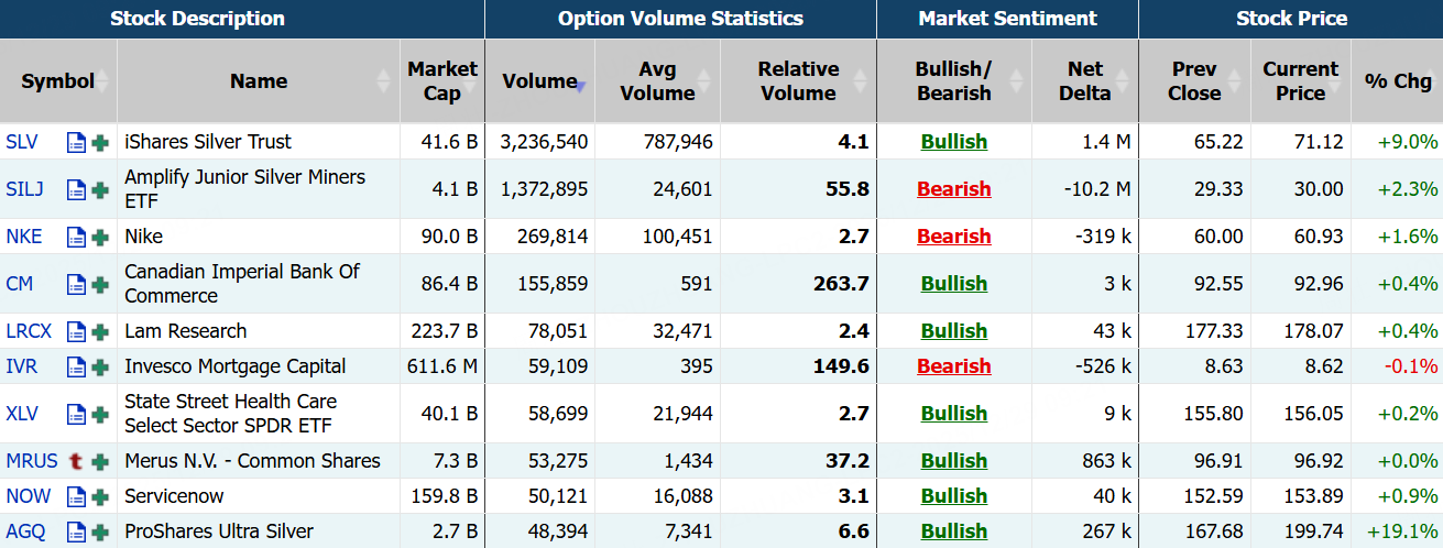 上週五,期權市場總成交量4545.13萬張合約,低於90日均量;英偉達成交325.55萬張,看漲期權佔比攀升至68.3%;白銀ETF成交323.65萬張,較90日均量放大逾4倍;Amplify Junior Silver Miners ETF成交137.29萬張,較90日均量放大逾55倍>>