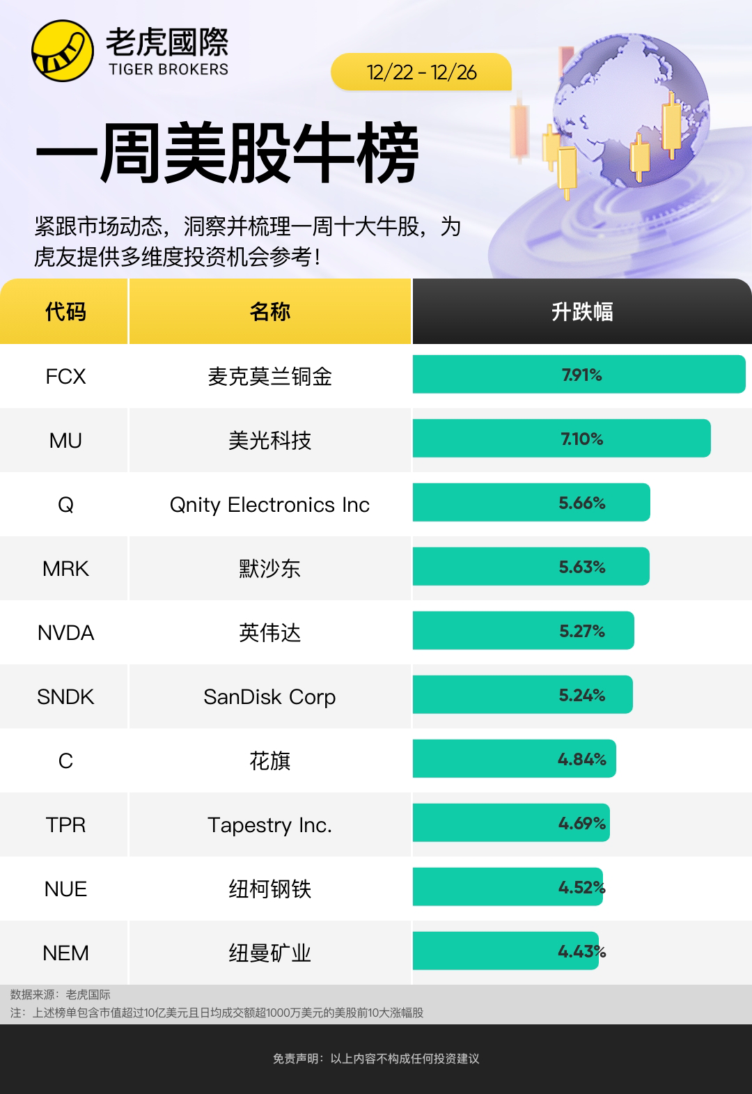 上週哪些股票表現優異?以下是截至12月26日當週,市值超過200億美元的美股中漲幅前十名: