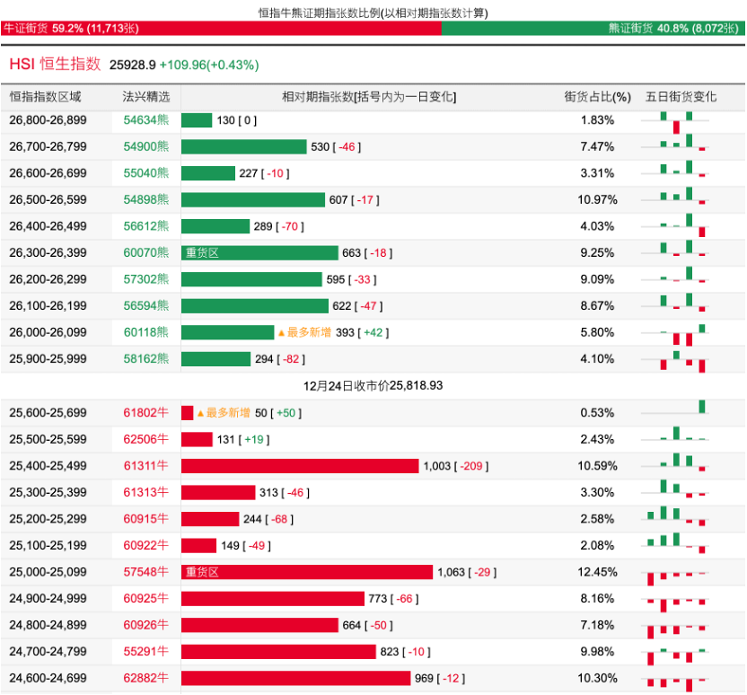 過去5日,恒指牛證合計約9361萬港元資金淨流入;恒指熊證則合計約8068萬港元資金淨流出套現。街貨分佈方面,恒指牛證街貨佔比約59.2%,分佈在收回價25000點至25700點之間,累計相當約2953張期指合約;恒指熊證街貨在收回價25900點至26400點之間,累計相當約2567張期指合約。
