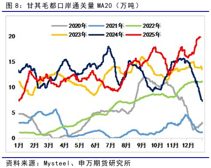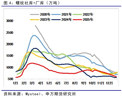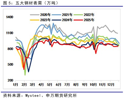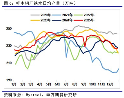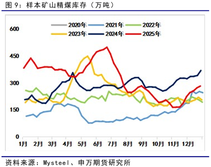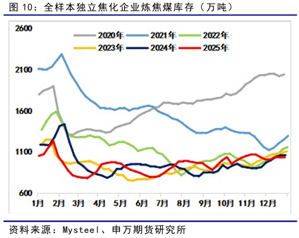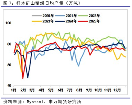 整體來看,本週五大材產量環比基本持平,五大材總庫存環比繼續下降,其中螺紋庫存降幅收窄、熱卷庫存降幅擴大,五大材表需環比基本持平,其中熱卷表需環比增加、螺紋下降,本週鐵水產量環比基本持平,但鋼廠盈利率小幅改善,預計後市鋼廠利潤改善、鐵水逐步復產,疊加節前下游剛需補庫帶來的成本支撐,判斷當前鋼材盤面跌幅有限、走勢將逐步企穩。重點關注後市鐵水產量走勢、鋼材庫存變化,以及卷螺差走闊的交易機會。供應方面:本週樣本礦山精煤與原煤產量爲73.96萬噸與187.35萬噸,兩者環比小幅下降,礦山精煤開工率環比小幅下降2.41%至84.21%,樣本洗煤廠精煤日均產量爲26.59萬噸、環比微幅下降0.7萬噸,當前蒙煤通關量在處於同期最高水平,獨立焦化廠焦炭日均產量爲62.67萬噸、產能利用率爲71.66%,兩者環比基本持平,樣本鋼廠焦炭日均產量與產能利用率分別爲46.8萬噸與85.52%,兩者環比基本持平。需求方面:樣本鋼廠鐵水日均產量爲226.58萬噸、環比基本持平,高爐產能利用率環比基本持平,樣本鋼廠盈利率爲37.23%、環比小幅增加1.3%。庫存方面:樣本礦山精煤庫存爲282.9萬噸、環比增加10.13萬噸,獨立焦化廠煉焦煤庫存以及庫存可用天數分別爲1039.72萬噸與12.47天,兩者環比基本持平,樣本鋼廠煉焦煤庫存以及庫存可用天數分別爲806.72萬噸與12.96天,兩者環比基本持平。價差方面:截至12月25日,蒙5主焦煤現貨1320元/噸、周環比持平,其倉單對應05基差爲18元/噸、基差周環比下降,準一級焦港口現貨價爲1460元/噸、周環比小幅下降,其倉單對應01基差爲-16元/噸、基差周環比下降。整體來看,本週精煤產量環比小幅下降,蒙煤通關仍處同期高位,焦煤供應端仍偏寬鬆,焦化廠與鋼廠的焦炭產量環比基本持平,樣本鋼廠盈利率環比小幅增加、鐵水產量環比基本持平,雙焦剛需企穩,判斷1月鐵水產量將隨着鋼廠利潤改善逐步回升,疊加採暖季動力煤需求旺季與下游節前剛需補庫的驅動,預計短期盤面進一步下跌的空間有限、呈震盪走勢,後市重點關注鐵水產量走勢、下游庫存變化、以及外煤通關量。