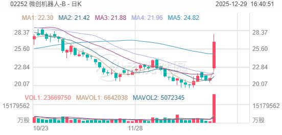 機器人概念股走強,微創機器人-B漲近26%,優必選漲超9%,越疆漲超7%,極智嘉-W、港仔機器人、三花智控漲超2%;